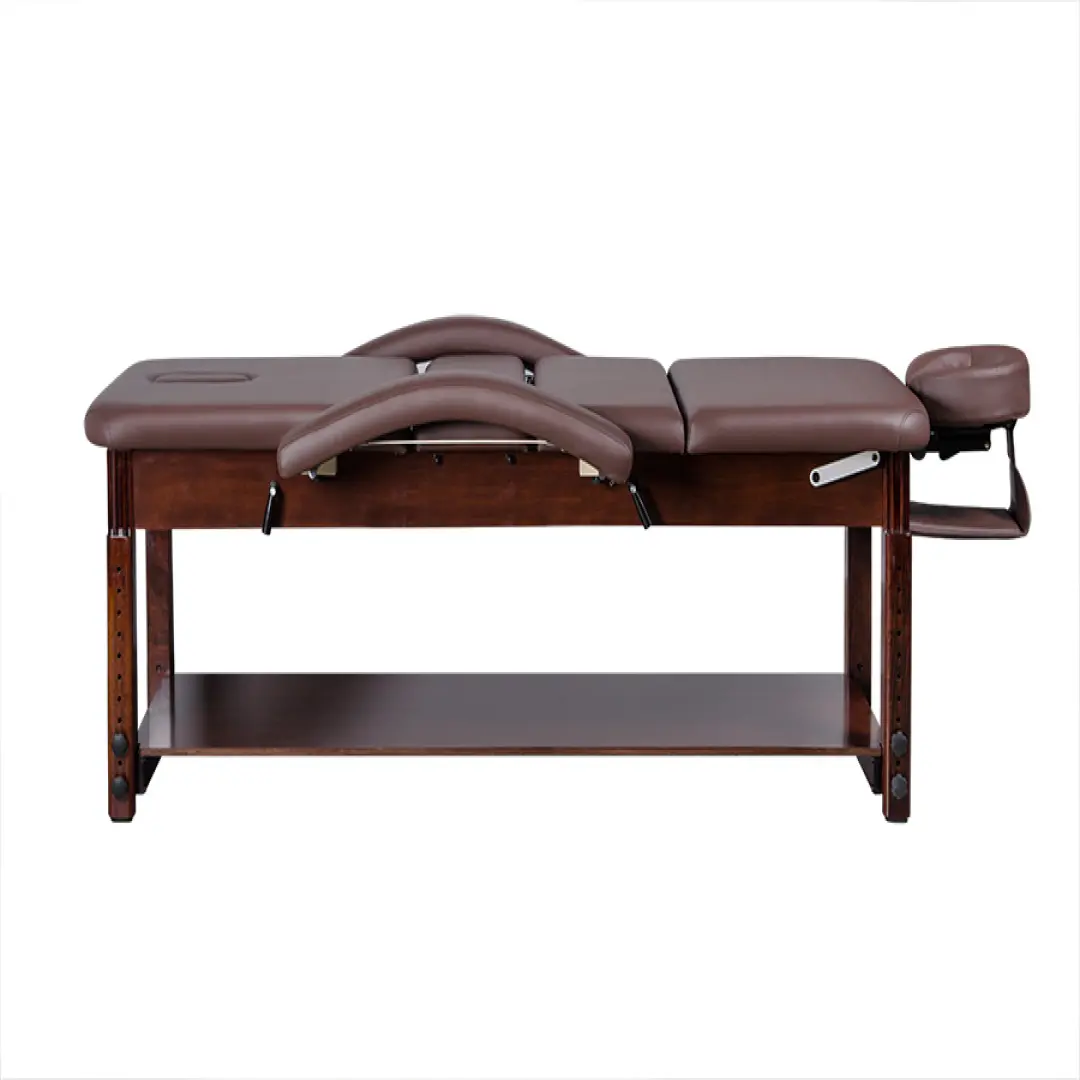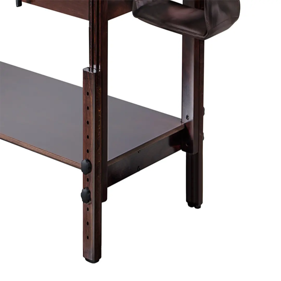 Его конструкция сейчас является более продуманной до мелких элементов, что способствует наличию еще большей прочности, функциональности и долговечности. Благодаря каркасу, который был произведен из экологически чистого бука, и наличию благородного шоколадного цвета, стол в любом массажном кабинете будет занимать основную позицию.